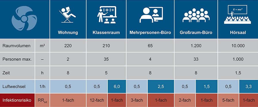 Wissenschaftler der RWTH Aachen haben das Infektionsrisiko durch aerosolgebundene Viren in unterschiedlichen Räumen mit unterschiedlicher Belegung analysiert – vom Hörsaal mit 1.000 Studierenden über das Klassenzimmer bis zur größeren Feier zuhause. Sie bewerten das Infektionsrisiko mit dem Coronavirus durch Aerosole insbesondere in Räumen mit langer Nutzungsdauer, hoher Belegungsdichte und ohne maschinelle Lüftung oder Lüftungsleitfaden – beispielsweise in vielen Klassenräumen – im Vergleich zu anderen Raumtypen kritisch. Auch private Feiern können aufgrund von geringem Luftwechsel viel riskanter sein als Veranstaltungen in gut belüfteten öffentlichen Gebäuden.