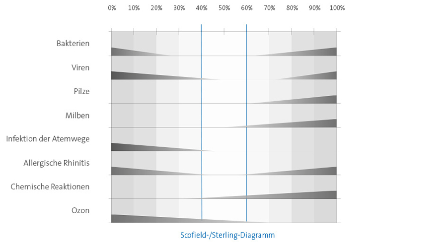 Im Bereich von 40 bis 60% relativer Feuchte ist die Belastung für den menschlichen Körper am geringsten! Dieser Bereich ist für Keime, Pilze und Bakterien sehr ungünstig, wodurch die Luft kaum Belastungen für den Menschen enthält. Das Risiko sich mit Grippe- und Erkältungsviren anzustecken ist hier minimal.